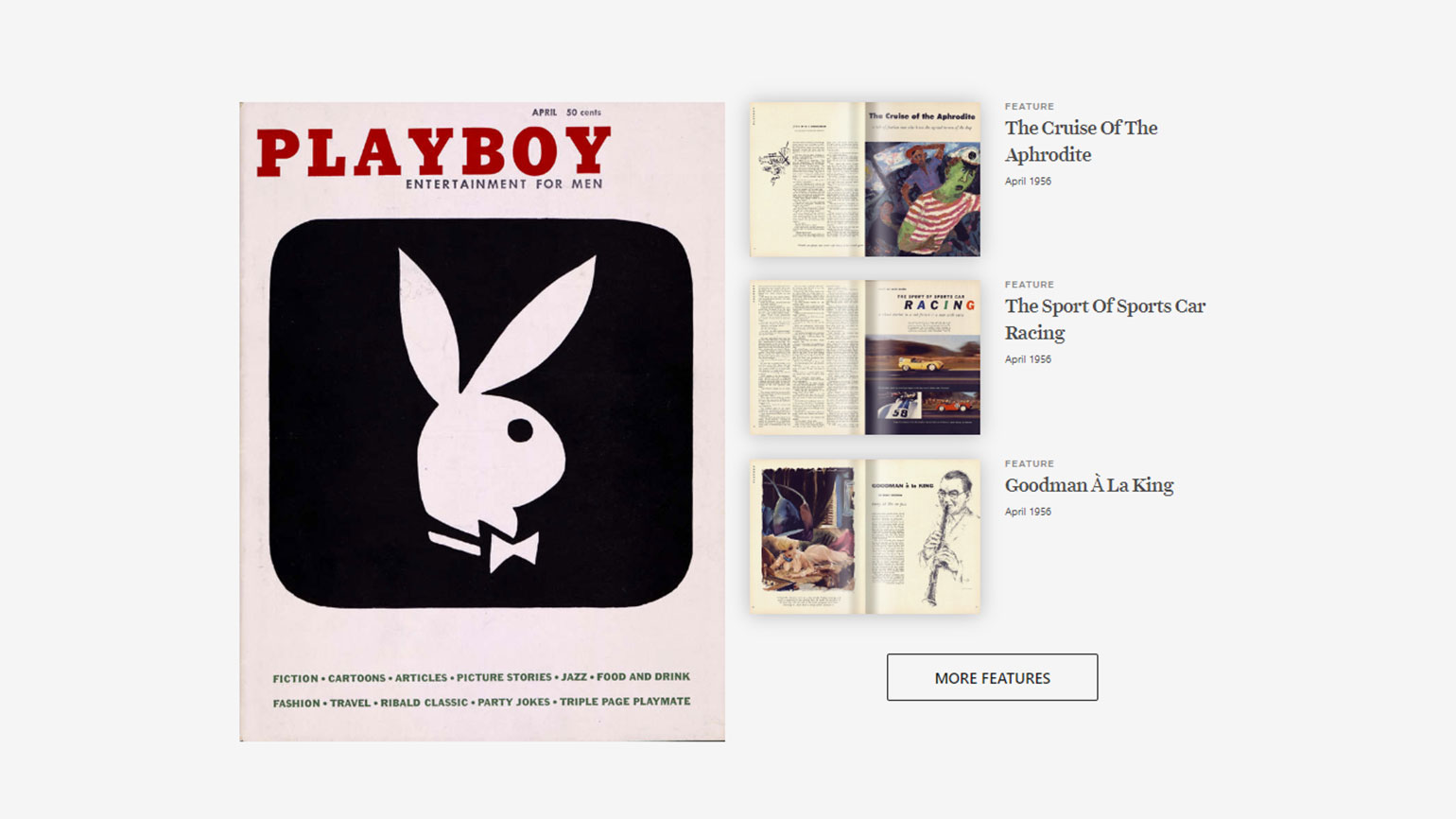 Обложка Playboy и развороты с объёмными статьями, апрель 1956 годаСкриншот: сайт Playboy / Skillbox Media