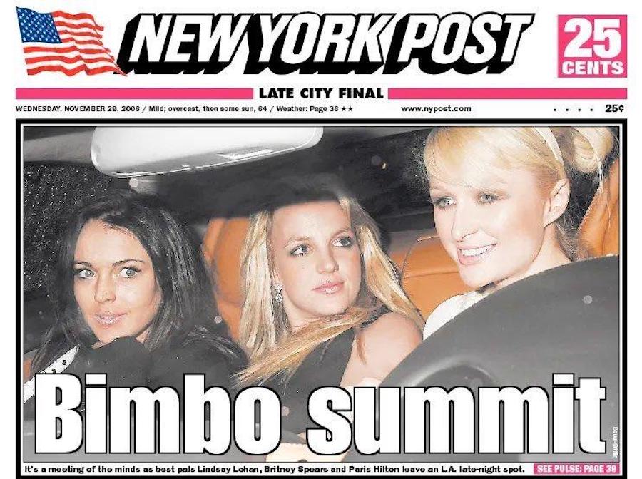 Слово bimbo в английский язык из итальянского в начале 1920-х годов и закрепилось как пренебрежительное обозначение привлекательной, но глупой или фривольной девушки. В нулевых, во времена моды на гламур, это слово часто использовали по отношению к знаменитостям того времени. Например, в ноябре 2006 года на обложке New York Post встречу Бритни Спирс, Пэрис Хилтон и Линдси Лохан не без юмора назвали «бимбо-саммитом».