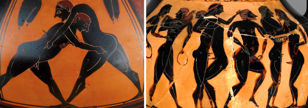 Частотным видом сексуального контакта между эрастом и эроменом считались всевозможные ласки, которые подробно отражены в вазописном материале. Именно благодаря визуальным источникам мы можем установить, что для взрослых греческих мужчин бедра безбородых юношей являлись одной из самых эротически привлекательных частей тела.