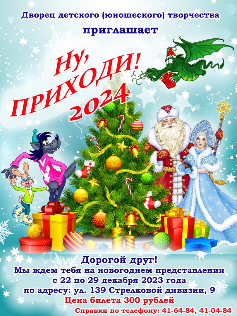 С 22 по 29 декабря ДДЮТ приглашает на новогодние представления для детей «Ну, приходи! 2024» (6+).