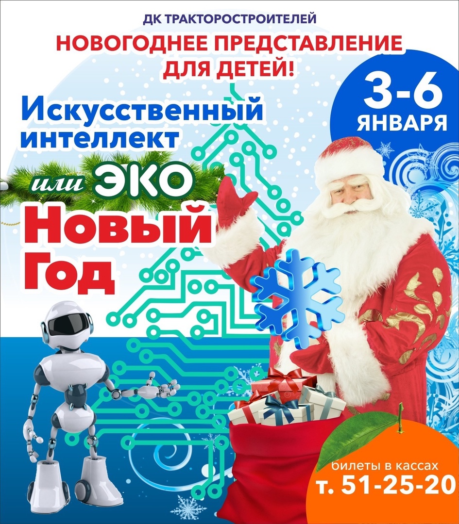 С 24 по 29 декабря и с 3 по 6 января во Дворце культуры Тракторостроителей пройдут новогодние представления для детей «Искусственный интеллект или ЭКО Новый Год» (6+).