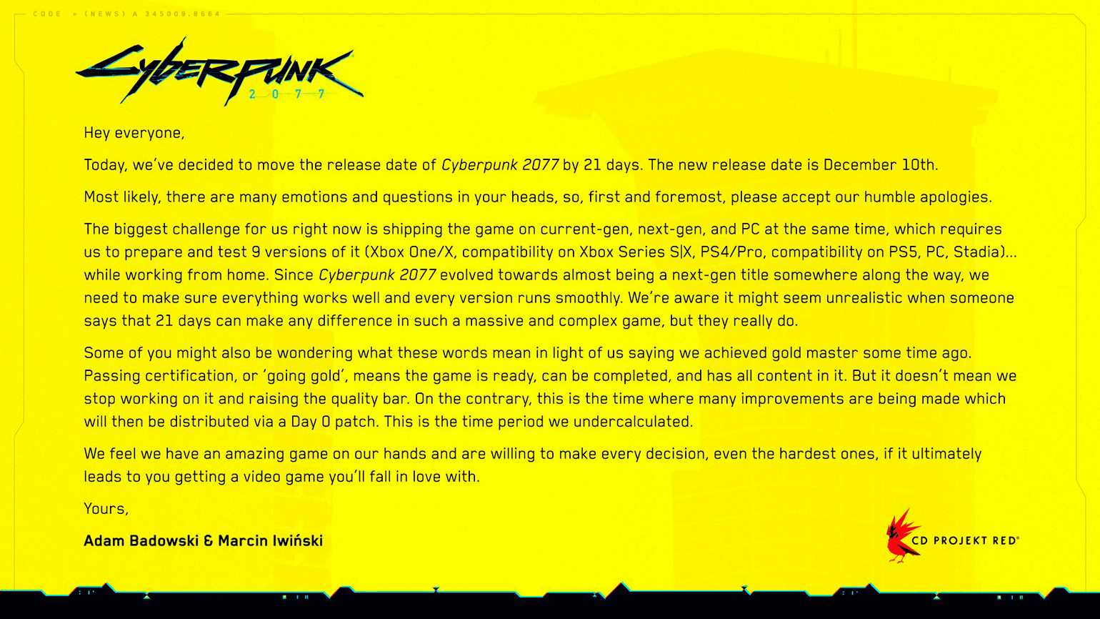 Обращение CDPR к фанатам о переносе игры на декабрь 2020 года. Изображение: CD Projekt RED