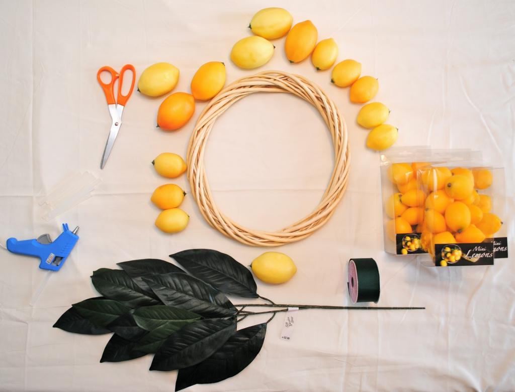 Оборачиваем кольцо лентой так, чтобы полностью скрыть основу. С помощью клеевого пистолета размещаем лимоны
