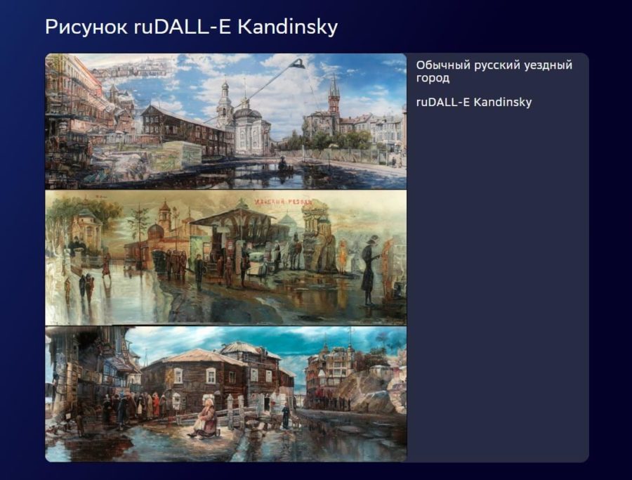 В 2022 году SberAI выпустила большую модель ruDALL-E Kandinsky, обученную на 12 млрд параметров. Она доступна в приложении «Салют» от SberDevices и в боте Discord. По словам разработчиков, генерация изображений учитывает точное описание желаемого и создает уникальные изображения, которые раньше не существовали. Их можно использовать для иллюстраций статей, а также в копирайтинге и рекламе.
