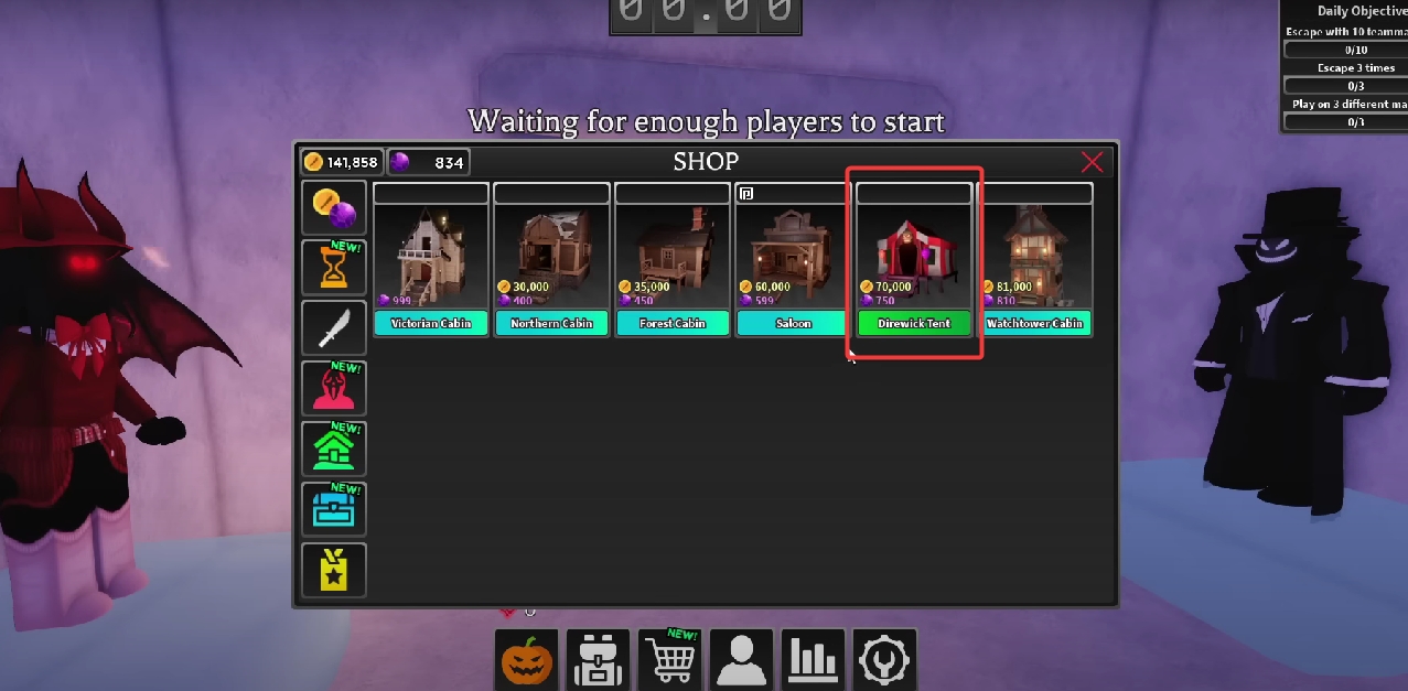 Moreover, there’s a new limited-time cabin, which, like the Snow Castle, will disappear after Halloween. It features spooky elements like spiders, and of course, we appreciate the curtain-style doors. There’s a place for one killer and four knives.