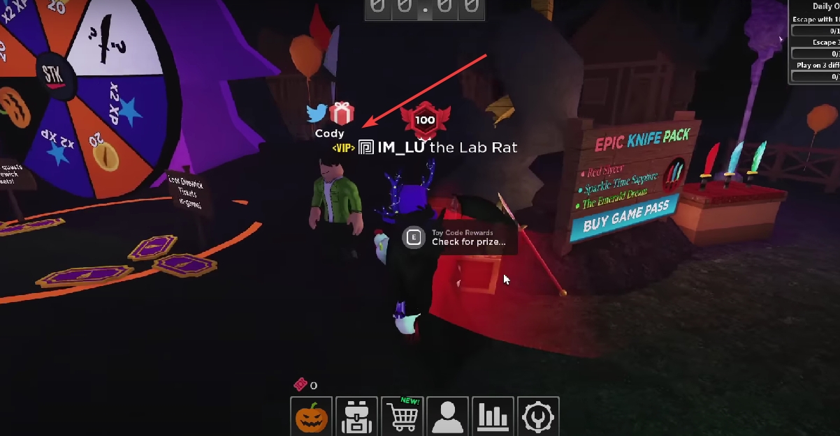 Up next, we have this quest, and now, what are these tickets for? These tickets are used for the spin wheel, where you can win coins, double your experience, and even get a mystery knife or a mystery killer.
