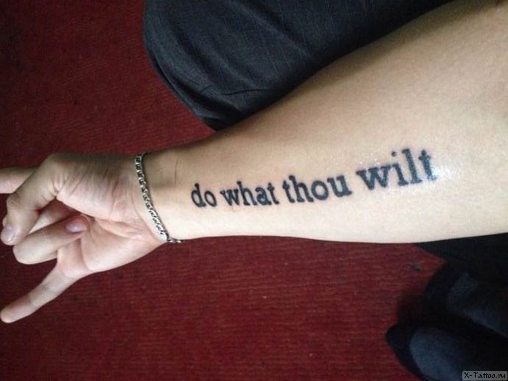 Предплечье артиста занято фразой «Do what thou wilt». Переводится как «Поступай согласно своей воле». Стиль надписи – старое английское выражение. Похоже на дань полученному зарубежному образованию.