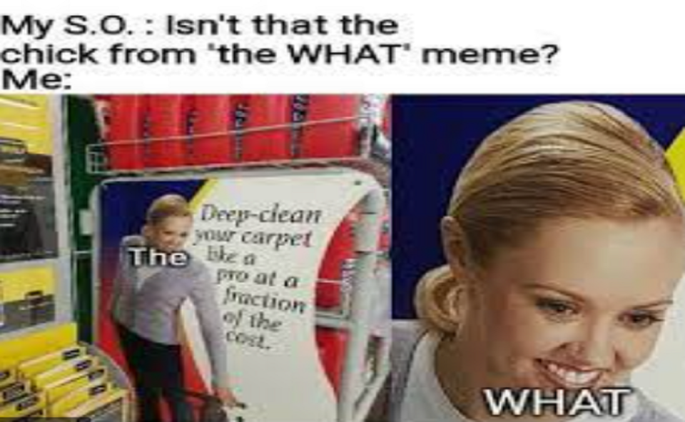 Знаменитый комический тренд, также известный как «Rug Doctor Woman Ad», появился в 2017 году. Он относится к серии макросов с изображениями, которые можно использовать, и сериям изображений реакции. Это изображение женщины, использующей чистящее средство для ковров, в рекламе Rug Doctor